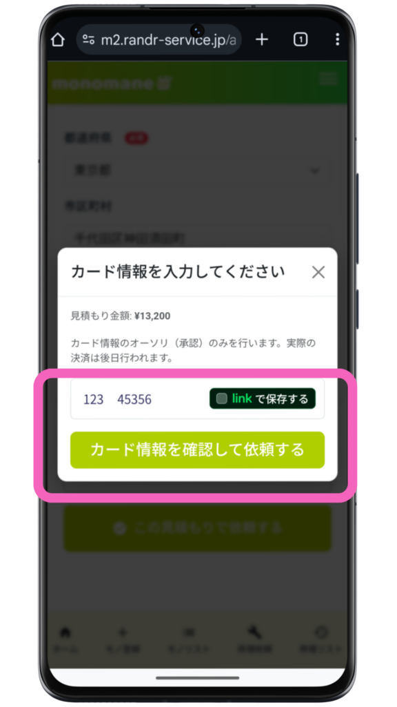 「カード情報を確認して依頼する」をクリックする。