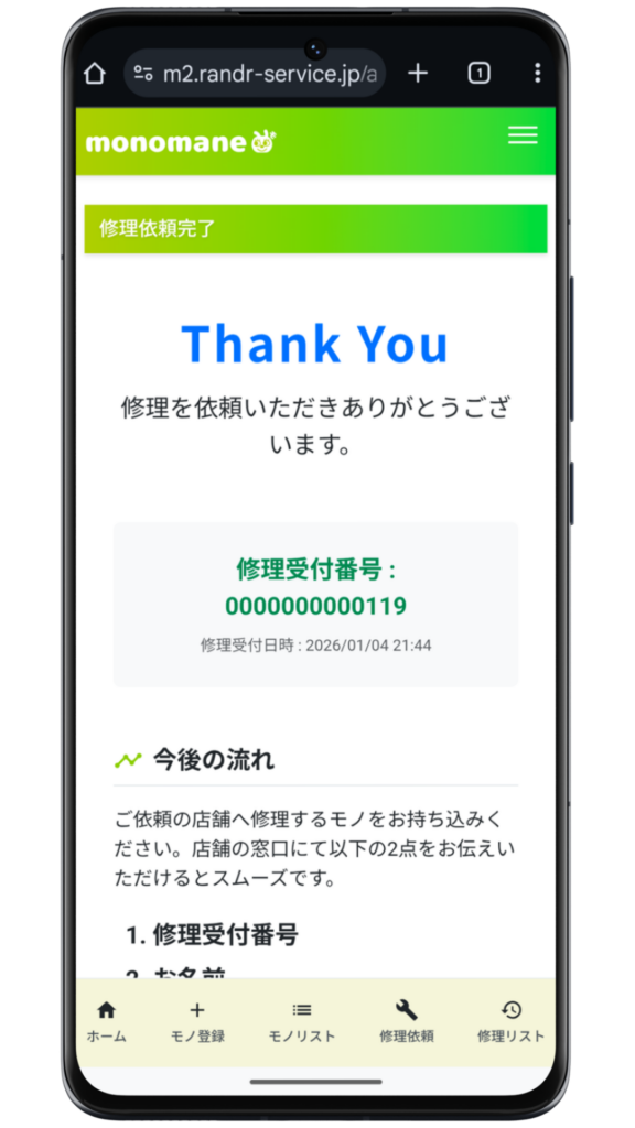 修理依頼完了画面が表示されたら、修理の依頼は完了です。おつかれさまでした!