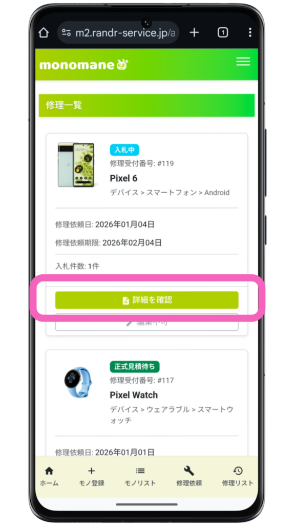 手順2:修理詳細ページを開く