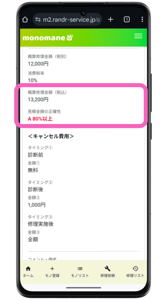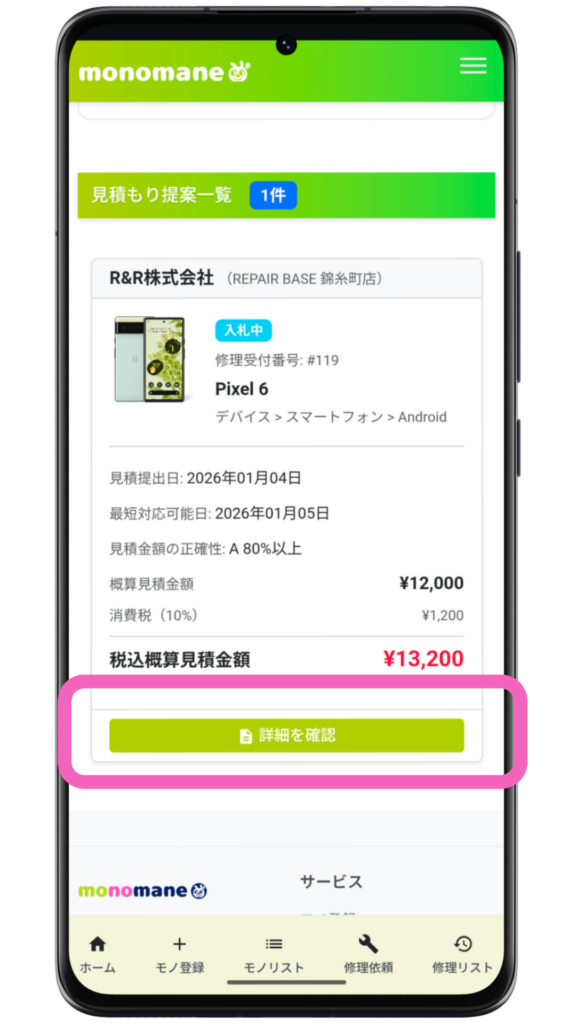 この記事では、monomaneで修理業者からの概算見積もりを確認する方法を説明します。修理業者が概算見積もりを登録すると、メールアドレスに通知が届きます。その後、このページで説明する操作を行います。
