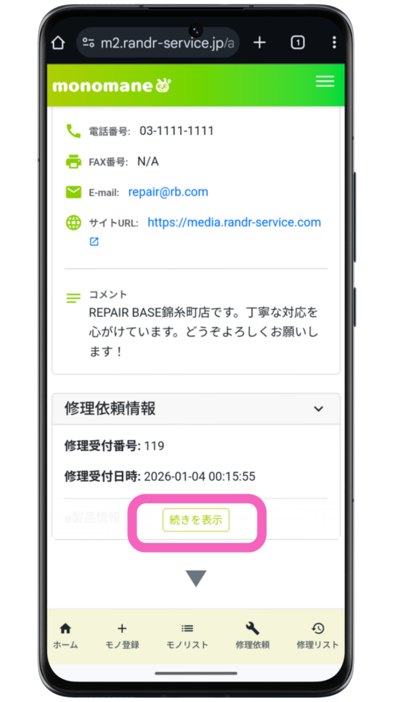 「修理依頼情報」の「続きを表示」をクリックすると、自身が依頼した内容を確認できます。