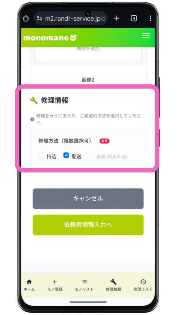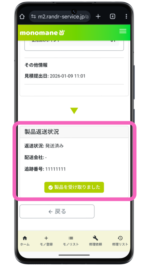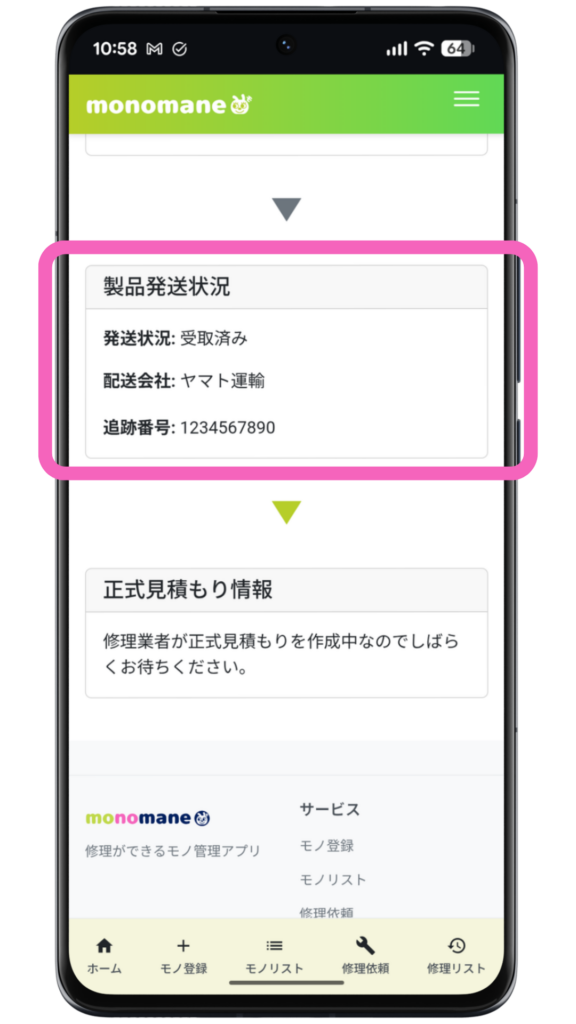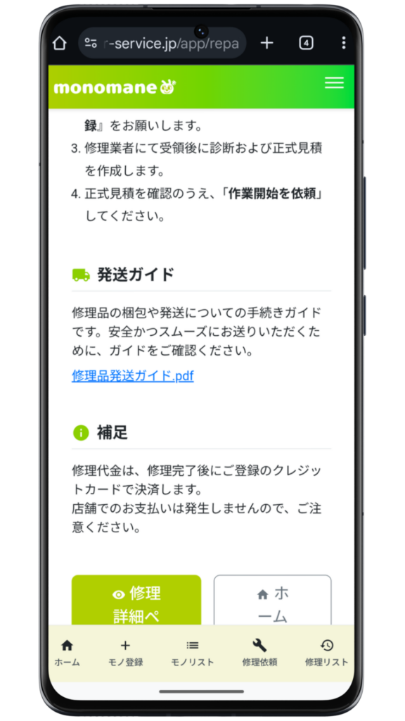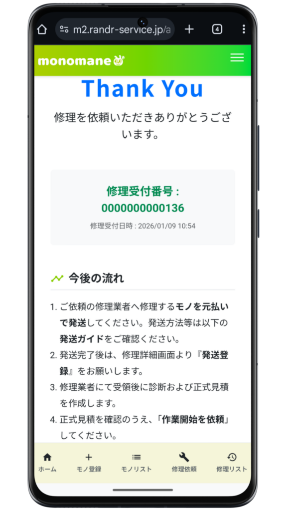配送修理の場合は、修理品を発送して、monomaneで「発送登録」を行う必要があります。