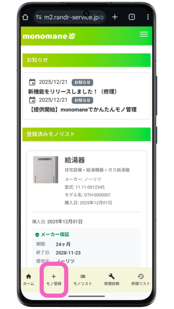 この記事では、monomaneでモノを新しく登録する方法を説明します。あらかじめモノを登録しておくと何かあったときにあわてず情報を確認し、スムーズに修理を依頼できます。
