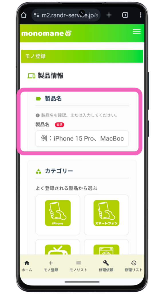 ホーム画面の下部メニューの「モノ登録」をクリックする。