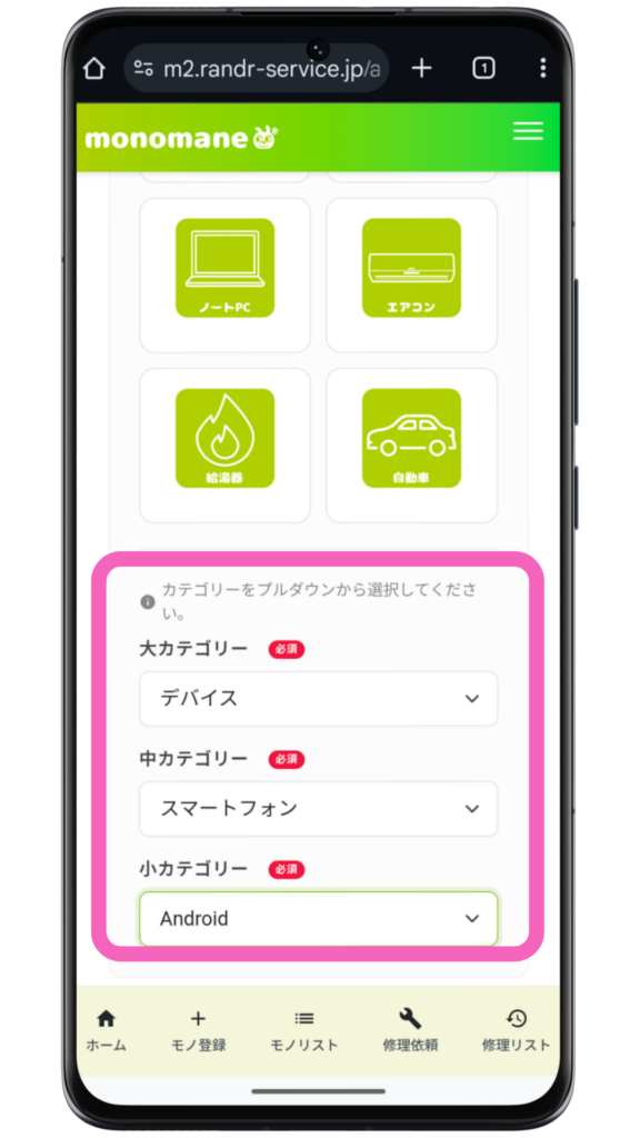 カテゴリー大・カテゴリー中・カテゴリー小を順番にプルダウンから選択する。