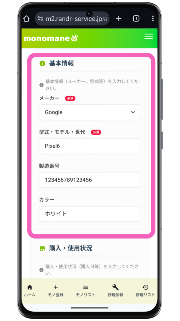 備考には何を入力していただいてもOKです。メーカーで「その他」を選択した場合のメーカー名や、その他忘れずに記録しておきたい情報などを入力します。
