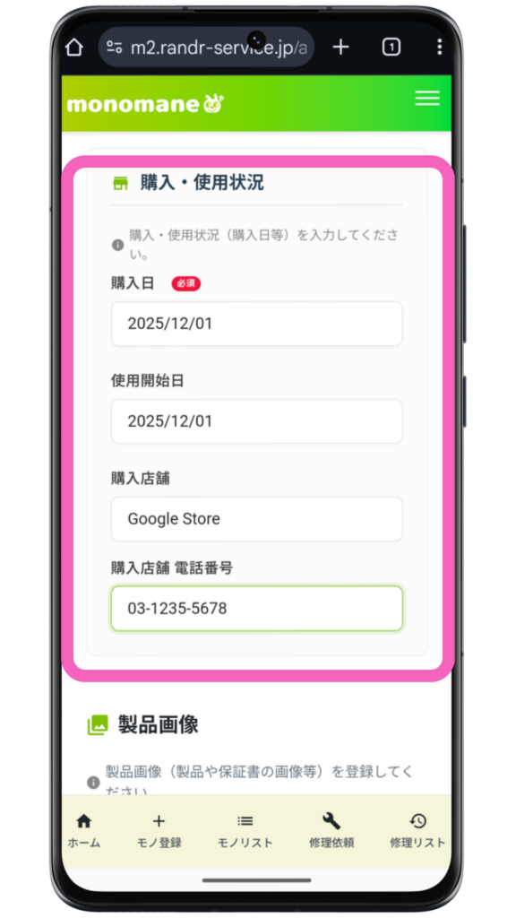 任意ですが、購入店舗や電話番号を登録しておくと、何かあったときに便利です。