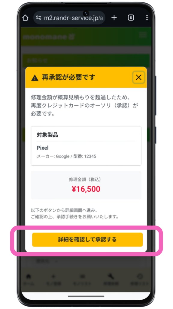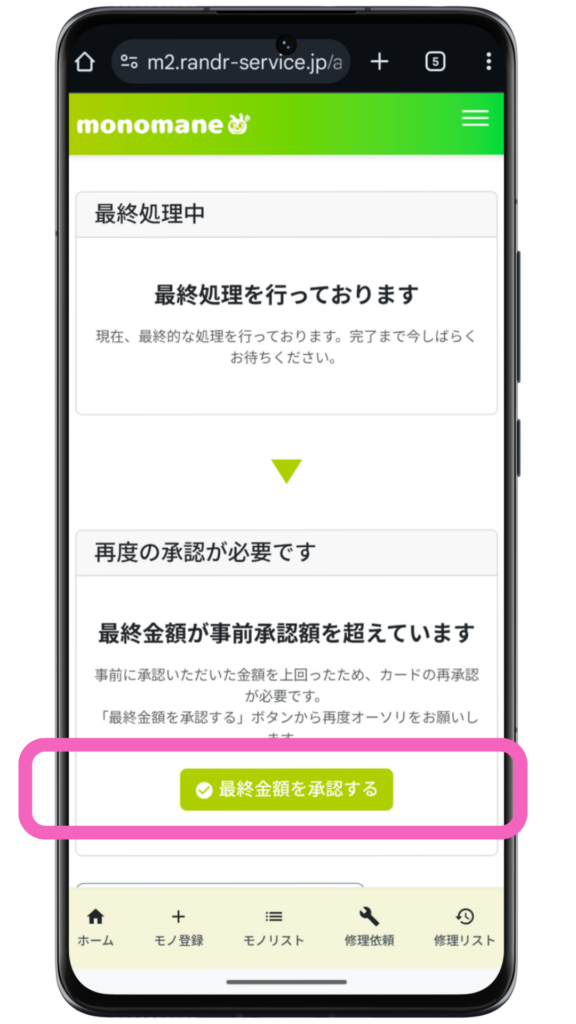 修理完了後に、確定した最終金額が概算見積金額を超えた場合、再度クレジットカードの承認が必要です。再承認の操作方法を以下で解説します。