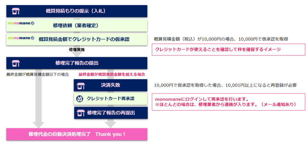 - 修理が完了して修理業者が修理完了報告を提出した際に、「最終的な金額」で自動決済されます